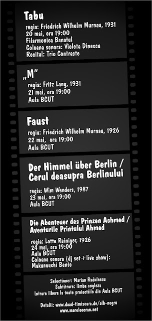 timişorenilor o scurtă retrospectivă a cinematografului expresionist german (Tabu şi Faust de Friedrich Wilhelm Murnau, „M” de Fritz Lang), un film de animaţie (Die Abenteuer des Prinzen Achmed / Aventurile prinţului Ahmed de